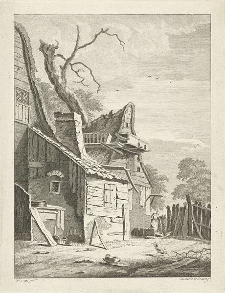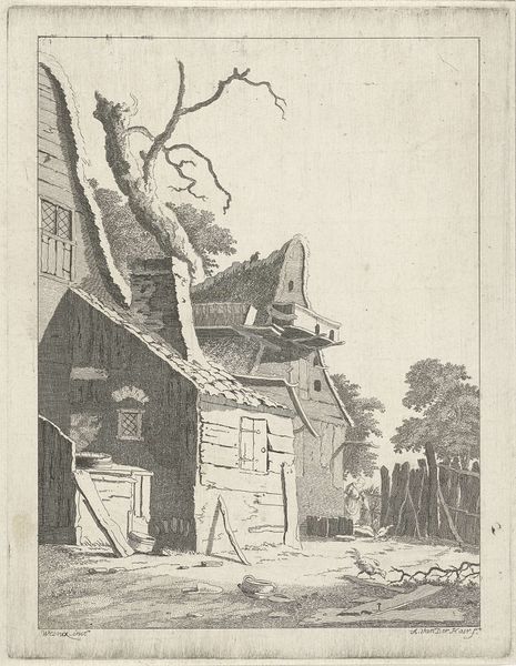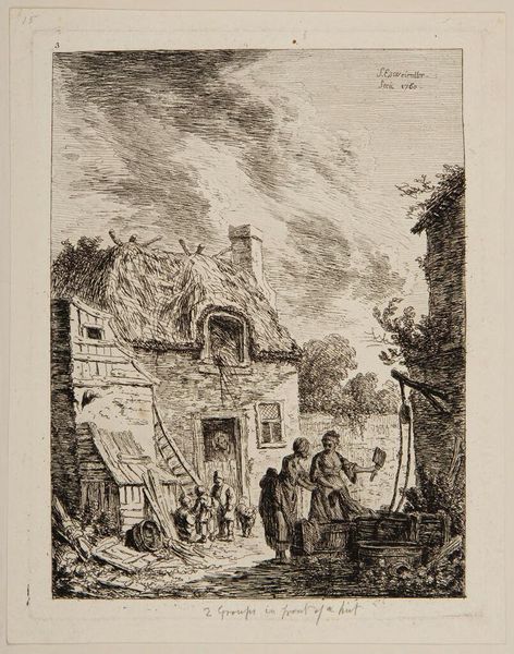 Anthonij van der Haer created this etching of a fisherman's home sometime in the 18th century. The image is made up of precisely etched lines that give the scene depth and texture. The subject matter is the everyday life of a fisherman and his family. The thatched roofs and rustic walls are rendered with an impressive level of detail, speaking to the realities of labor and class in the 1700s. The artist uses line and texture to give the scene a tangible quality; you can almost feel the rough texture of the wooden planks and the coarse weave of the fishing nets. The image celebrates the value of labor and the beauty found in simple, functional objects, like the fishing nets and the fisherman's tools. These are essential for survival, reflecting the fisherman’s trade and his connection to the sea. This etching by Van der Haer invites us to reflect on the intersection of art, craft, and social context, challenging traditional notions of high art and encouraging us to recognize the artistic value of everyday scenes.