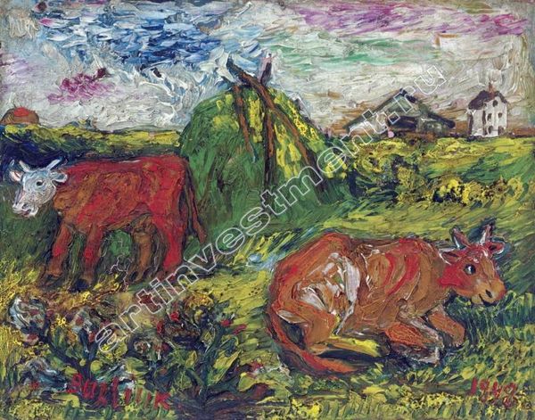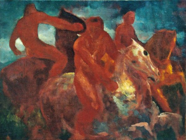 Editor: This is Emil Nolde's "Wildly Dancing Children," done with oil paints. It has a palpable energy and rhythm, almost like I can hear the music they’re dancing to. What jumps out at you when you look at this work? Curator: The formal dynamism is striking. Note how Nolde orchestrates a chromatic scale of vivid, unmodulated colors, from the fiery reds and oranges in the figures to the cool greens and blues of the ground. The composition defies traditional perspective, flattening the space and prioritizing the sheer force of color. Editor: So the distortion of reality is intentional? Curator: Absolutely. Consider how Nolde applies paint. Short, deliberate strokes build a textured surface, disrupting smooth transitions and contour lines. The children are not rendered as accurate portrayals but as vehicles for exploring expressive color and form. How does this departure from naturalism impact your interpretation? Editor: I see what you mean. It's less about capturing reality and more about conveying raw emotion and energy. It's fascinating how the brushstrokes become as important as the subject itself. Curator: Precisely. The structural elements—the brushstrokes, color choices, and distorted forms—communicate meaning. Nolde explores the expressive potential inherent in the materials of painting. This allows for a rich interpretation focused on the materiality and formal components. Editor: That’s a fresh approach! I had focused on the feeling it evoked but now I see the skill in the execution and material choices too. Curator: By examining Nolde’s methods, our understanding is deepened and enlivened.