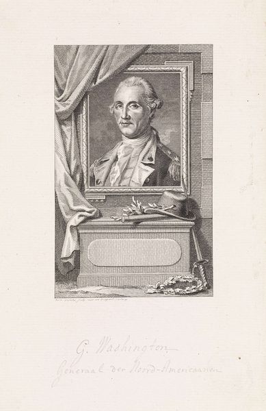 Editor: This is Johann Friedrich Bause's portrait of Caspar Richter. The framing feels both classical and theatrical to me. What symbols or imagery stand out to you? Curator: Notice how Richter is presented within a window-like frame, adorned with garland, reminiscent of Roman triumphal arches. It suggests he's not merely an individual, but a figure worthy of public honor. The medallion below his name further emphasizes the idea of celebrated virtue. Editor: So the framing itself carries symbolic weight? Curator: Precisely. And consider Richter's gesture – an open hand, as if offering something. Is it a gift, an invitation, or perhaps a symbolic representation of his character? These visual cues speak volumes about how Richter wished to be perceived, and how Bause sought to immortalize him. Editor: I never would have noticed all that! Thanks!