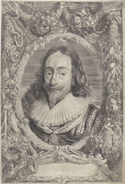 Curator: Standing here, we see an engraving titled "Portret van Ferdinand III" or, Portrait of Ferdinand III, after 1644, housed here at the Rijksmuseum. The artist is Pieter van Sompel. Editor: Wow, what strikes me immediately is the level of detail. It's almost overwhelming! You get lost in the textures – the armor, the lace collar, even the cherubic figures adorning the frame. It has a kind of formal severity about it but rendered with such delicate skill. Curator: Absolutely. Engravings like this one served a vital purpose. Before photography, disseminating a ruler's image was key to projecting power and establishing legitimacy across vast territories. Consider the Baroque style—with its characteristic ornamentation. Editor: The dragons flanking the crest up top feel ripped from a fairytale, a stark contrast to Ferdinand’s severe expression, or what looks to be a subtle eye-roll. How do you even make something like this on metal? Curator: The process involved meticulous handwork, etching lines into the metal plate, which would then be inked and used to create multiple impressions. Think about the cultural context too. Ferdinand III reigned during the Thirty Years' War—a period of intense religious and political upheaval in Europe. Images like this played a crucial role in constructing his image and bolstering morale, even as peace talks unfolded. Editor: Knowing that background, the image becomes almost like propaganda. The artistry tries to sell the stability Ferdinand theoretically offered while the battles still raged outside the frame. And yes, knowing this was done on metal really underscores its intent. How persistent and indelible can we make this all look? Curator: Exactly. It’s important to remember that these weren't passive artworks, they actively shaped public perception, which has lasting significance in our memory and legacy of power. Editor: It makes you wonder what portraits today, carefully curated for social media, will reveal about our leaders and society centuries from now. Everything's carefully edited for maximum control. Makes you think. Curator: Precisely, that's a crucial point. Examining portraits like this from a historical perspective offers a rich insight into power, representation, and the complex interplay of art and politics, that resonate into our modern world.