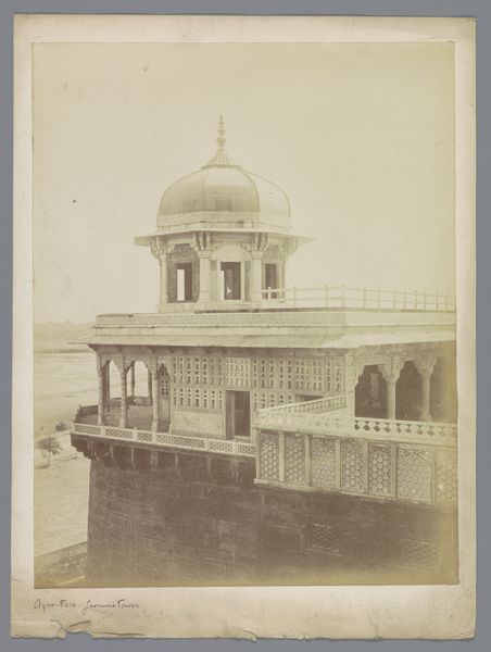Editor: This is Samuel Bourne’s “View of the Panch Mahal at Fatehpur Sikri, Uttar Pradesh, India,” a gelatin-silver print dating from the 1860s. The architecture has this incredible, almost dreamlike quality in this hazy sepia tone. What historical layers am I missing here? Curator: This image, like much Orientalist art, invites us to unpack its complex relationship with colonialism. Bourne was a British photographer working in India during the height of British colonial power. The Panch Mahal itself was built during the Mughal Empire, representing a fusion of Persian and Indian architectural styles. What do you make of Bourne choosing this specific structure? Editor: Perhaps its visual distinctiveness appealed to him, as something exotic and worthy of documentation. Curator: Precisely, but it goes deeper. Bourne wasn's simply documenting; he was framing, composing, and interpreting. Consider who this photograph was intended for: a Western audience. Images like this reinforced a certain narrative about the East as ‘other,’ exoticized, and ultimately, something to be possessed or controlled, even subtly. Editor: So, Bourne's work, even seemingly objective landscapes, contributed to a broader political agenda? Curator: Absolutely. By emphasizing the grandeur of Mughal architecture while remaining silent about the socio-political realities of British rule, he created a selective, and ultimately, skewed view of India. Consider how the lack of human presence in the photo emphasizes the architectural monumentality. Editor: It really does make the building feel frozen in time, divorced from its context. I guess I hadn’t thought about how much a landscape could reflect power dynamics. Curator: It's a crucial point. These images weren't neutral; they were active participants in shaping perceptions and justifying colonial projects. Now, looking at it again, does the image speak differently to you? Editor: It does. I’m now a little more aware of whose gaze is privileged and who or what gets erased in the process. Thanks for this. Curator: My pleasure.