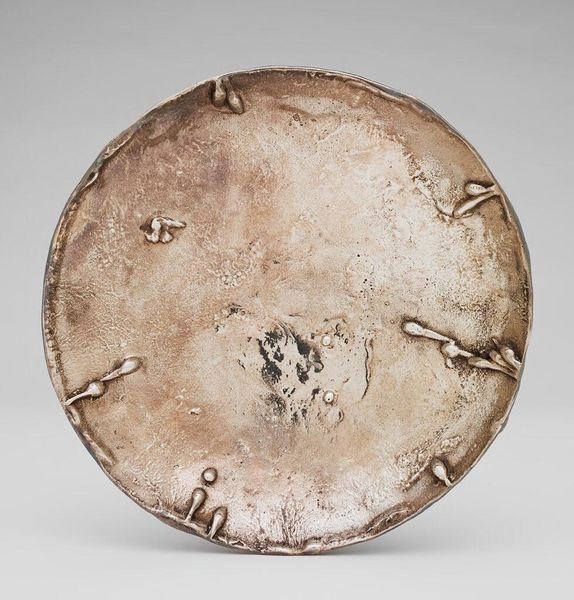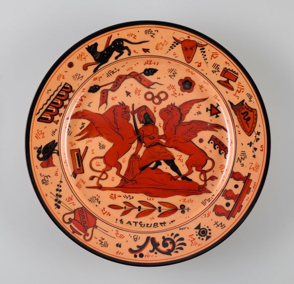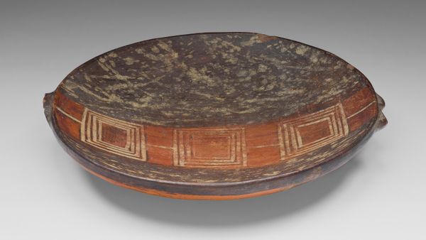 Curator: Here we have a ceramic plate, dating from 600 to 900 AD. It is a Maya piece, currently held at the Minneapolis Institute of Art. Editor: Well, immediately, I'm drawn to the obvious cracks – the plate’s fragility and survival over all these years is striking, considering its apparent function and usage. And the figures! Such angular depictions of the seated human figures are intriguing. Curator: Absolutely, the cracks are a testament to the passage of time and the material's vulnerability, but the plate still stands as a testament to Maya artistry. If we consider this object within the context of Maya culture, the painted scenes offer insights into their beliefs and societal structures. How do the production methods contribute to this interpretation? Editor: As for the methods, the plate would likely have been fashioned by hand, then painted meticulously with natural pigments—possibly ochre or iron oxides to achieve these reddish tones. This object shows signs of skilled labor combined with readily available local materials, placing it in a tradition of communal creation and resourcefulness. Each step connects intimately to available expertise and accessibility of natural supplies. Curator: Yes, and those reddish hues provide visual cues, hinting at blood, royalty, or vital life forces deeply entwined in Maya symbolism. I am curious, what considerations arise when the artwork displays multiple levels of meaning simultaneously? Editor: It compels a look at both the decorative elements and the representational aspects. This plate exists in a matrix of usage—is it ritual, is it communal, is it trade—with material composition always closely reflecting its socio-economic function within that structure. I wonder if it would provide any unique insight to know how widely pieces like this were circulated, and among whom. Curator: Such an understanding encourages an open reevaluation of how societal power dynamics manifest through accessible domestic materials. The ability of this piece to serve both function and broader ideology is why it’s remained fascinating through its long history. Editor: And for me, its very physicality—the tangible link it gives us back to this world of material engagement and making, makes it ever appealing. I am left admiring not only its artful design, but all those steps from raw materials to skillful craftsmanship that preceded this moment of cultural display.
