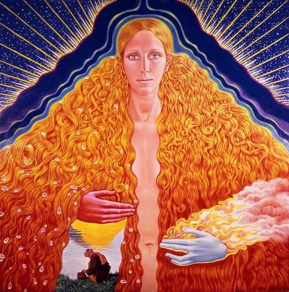 Curator: Let’s examine Abdul Mati Klarwein’s painting, "Moses and Aaron," crafted in 1971 with oil paint. What is your initial response to the piece? Editor: Well, my first impression is that it exudes a surreal intensity. The dual portraits against that almost lunar landscape create a powerful sense of dichotomy and mystical encounter, really hitting me on a visceral level. Curator: Indeed. Klarwein masterfully interweaves diverse symbolic registers here. We see not only these figures, reminiscent of iconic representations of Moses and Aaron but also elements from Kabbalah and perhaps broader spiritual traditions. Consider that the figures blend into one another—notice the symbolism of duality. Editor: That blending really stands out. The contrasting skin tones of the figures – the light and the dark – set up immediate readings of race and identity, especially in the sociopolitical context of 1971. It provokes questions about how Klarwein engages with power dynamics, particularly colonialism and its visual legacies. Curator: Yes, Klarwein, as I read it, uses the opposition to express the connection and synthesis within complex identities. It may be about complementary, not conflicting forces. Look closely: both wear headpieces adorned with symbols. The very lines converging in the background suggest invisible ties. Editor: But is it really 'synthesis,' or are these visual languages still mediated through power? It's intriguing, sure, this blending, but the painting has to be viewed in its historical moment, where appropriation and exoticization were, and still are, pervasive. The visual exoticism, let’s not ignore, it feeds directly into established stereotypes, whether Klarwein intended it or not. Curator: That is a very valuable point to be made, certainly. One must consider this in light of those socio-historic factors you are citing. I'm interested, in contrast, by the more perennial symbology at play in Klarwein's synthesis. I believe, looking deeper, he transcends historical context in some ways, expressing enduring archetypes of transformation and leadership. Editor: I'm not so sure. Ultimately, while the painting is captivating on a purely aesthetic level, it is far too easy to separate its image from any engagement in real-world injustice, or the struggle that defined its own era. I see visual echoes from past oppressions that refuse simple resolution through spiritual platitudes. Curator: A potent note on which to consider this artwork, reflecting upon the burden of its reception and reinterpretation through time. It has been a useful reminder, indeed. Editor: Yes, for me, situating "Moses and Aaron" within a web of race, representation, and the fraught language of cultural exchange is essential work when reckoning with its impact.
