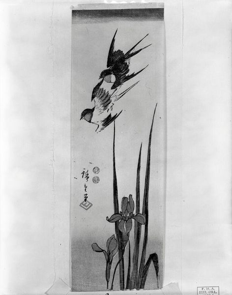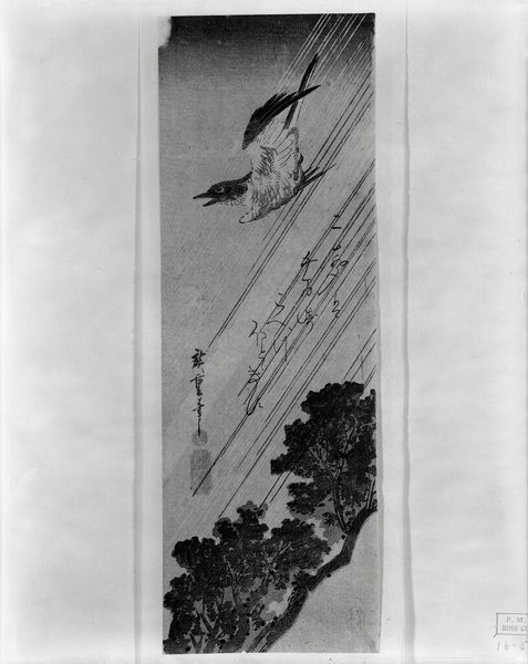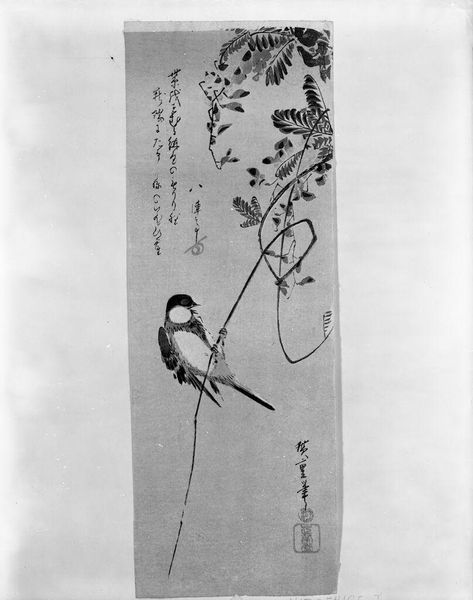 Curator: What a striking image! We’re looking at a print called "Bird" by Utagawa Hiroshige, the renowned Japanese artist who lived from 1797 to 1858. It’s part of the collection here at the Harvard Art Museums. Editor: My first thought? Graceful. The bird itself feels almost suspended in mid-song, poised but still. The composition, with the cascading tail feathers, is so dynamic. Curator: Hiroshige really captures the essence of movement, doesn’t he? The delicate lines used to depict the feathers, the angle of the bird's body, the way it’s perched above the flowering branch – all contribute to this sense of fleeting beauty. Editor: And the interplay of positive and negative space is masterful. The bird and branch aren't just objects; they define the space around them, creating a visual rhythm. Curator: Absolutely. And I think that's why the piece feels so timeless. It's not just a picture of a bird; it's a moment captured, a feeling evoked. Editor: Yes, you’re right. It’s a fleeting moment, perfectly still.