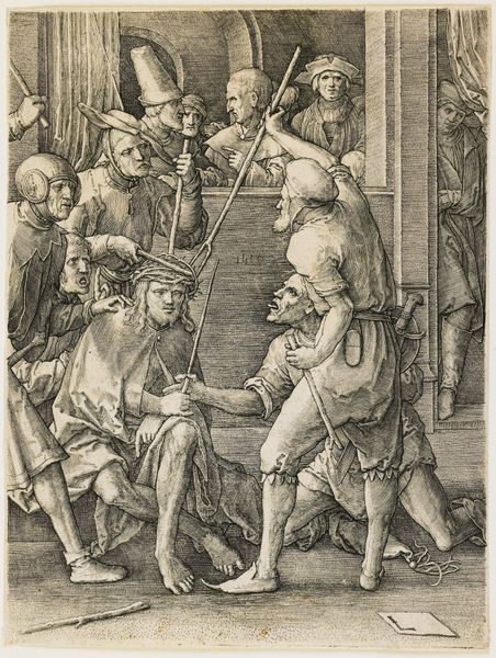 Curator: Today we're looking at "Engraved copies of The Little Passion," prints by Albrecht Durer, dating from 1485 to 1699. They're currently held at the Metropolitan Museum of Art. Editor: This is intense. The dark lines really give it a harsh, almost brutal feeling. There's so much going on in such a small space, and I'm immediately drawn to the figure being presented to the man seated on the throne. What can you tell me about how Durer uses line and form here? Curator: Notice how Dürer's mastery of engraving allows him to create a remarkable sense of depth and texture, even without color. Observe the meticulous cross-hatching. How does this technique contribute to the overall impact of the print? Editor: It creates strong contrast and defines the shapes, adding to that dramatic tension I felt at first glance. Are there ways that the composition draws your eye to a focal point? Curator: Absolutely. Consider the central placement of the figure kneeling, juxtaposed with the imposing figure on the throne. The convergence of lines and gazes emphasizes the power dynamic within the scene, but it's important to acknowledge the spatial flattening, almost compression of space. Why do you think Dürer, or rather his copyist, employs this stylistic device? Editor: I suppose it intensifies the scene, placing us right in the moment. The figures seem crowded and chaotic. Almost claustrophobic! Curator: Precisely. It heightens the emotional impact of the Passion. The rigid lines evoke the emotional austerity of the era, yes? Consider the geometry of suffering expressed in pure, visual terms, and ask what meaning we draw from this. Editor: That’s interesting…seeing the “geometry of suffering.” I hadn't thought about it that way. Curator: These formal qualities enhance the narrative but also exist as self-sufficient entities. What did you get out of viewing these prints with me? Editor: I appreciate understanding how the artistic style is integral to understanding what's portrayed. It helps connect to the work more deeply. Thanks.