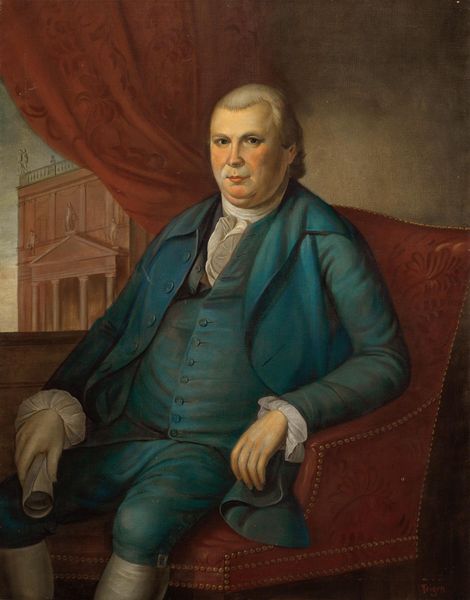 Curator: This is Charles Willson Peale’s "John Nicholson," an oil on canvas portrait dating back to 1790. Editor: There's an almost unsettling calmness. The muted colors, the posed stillness—it speaks of a very particular kind of control. Curator: Absolutely. Peale was deeply embedded in the political and intellectual circles of his time, and his portraits often reflect the ideals of the Enlightenment. Think about what the materiality of portraiture meant at that time, for example—how it reinforced social hierarchy. Editor: True. It’s interesting to think about the labor involved—the preparation of pigments, the weaving of the canvas, even the tailoring of his clothing. The act of displaying a figure amidst these objects really showcases consumption. Curator: And Nicholson himself would have been carefully crafting his image. Note the trappings of a scholar or gentleman, with the book, quill, and the hint of a library in the background. What class aspirations do these elements express? It speaks to his standing and access to knowledge. Editor: But it's also a commentary on access to resources. Who had the leisure time to pursue knowledge? To commission such a portrait? The materials and means to produce these elements would not be distributed equally throughout society. Curator: It is crucial to ask what it meant to fashion a narrative about oneself in the late 18th century. Peale here creates a particular kind of visual rhetoric through his application of neoclassical artistic philosophy. Editor: The composition seems very intentional, maybe even too refined. It almost feels like propaganda. A careful presentation to maintain a very specific material status in society through art and craft. Curator: So, by studying this, we uncover so much about the power dynamics of the era—who gets remembered, how they want to be seen, and the resources it takes to manifest that vision. Editor: Precisely. The image of Nicholson is not just paint; it's the culmination of resources, aspirations, and the labor of many hands—visible and invisible. A neat reminder that art and object are reflections of wider material conditions.