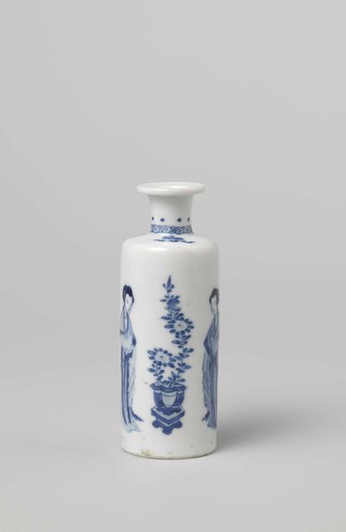 Curator: Isn’t this cylindrical bottle vase exquisite? It's believed to have been created sometime between 1680 and 1720, crafted by an anonymous artist. I'm just taken with the subtle grandeur given the medium is simply ceramic, but look at the auspicious symbols throughout. Editor: It does strike a certain balance, doesn’t it? The blue and white – so calming, almost meditative. I see how the patterns, scrolls and geometric forms give it this grounded feeling... but what’s with the...sea creatures? They look a bit goofy to be serious symbols. Curator: Ah, but that’s precisely where it becomes interesting! These aren't merely decorative. They represent wishes for prosperity and happiness, almost functioning like protective charms in the home. That motif repeats, you see, enclosed within those delicate petal borders. The overall design, though intricate, delivers a cohesive message about good fortune, connecting it back to ancient philosophies. Editor: So each motif tells a story? Makes me think how objects like this are time capsules—full of the beliefs of people long gone. But look again; those zig-zags! They suggest both mountains and maybe even teeth. Curator: Yes! The use of symbolic language offers a powerful glimpse into their world view. And this cultural information is quite enduring as such designs often transcend epochs. It's a conversation piece whispering across centuries. Editor: Okay, cultural messages in a bottle then! Maybe it’s less meditative, more like concentrated calm, a piece of peace and perspective. Curator: Exactly. Imagine the artisan meticulously painting each symbol, infusing the object with intention, now, years later we stand as beneficiaries of that gesture, receiving not just beauty but blessings. Editor: Well, now I feel compelled to carry it carefully and think noble thoughts. It’s got that kind of vibe. Curator: Let’s appreciate then its historical, cultural, and even spiritual significance, as such it has now become timeless. Editor: To history and happy thoughts!