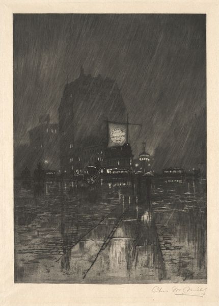 Curator: This gelatin-silver print, entitled "Night, New York," is by Alfred Stieglitz. It's thought to have been made sometime between 1897 and 1934, capturing a nocturnal cityscape. Editor: My first impression is one of stillness, almost unsettling in its quiet. The street is slick with what looks like rain, reflecting the sparse, blurry lights. Curator: Stieglitz was deeply invested in elevating photography to the status of fine art. His work, particularly during this period, often sought to emulate the soft focus and atmospheric effects of Impressionist painting, reflecting a very pictorialist approach. Editor: And he uses those painterly effects to explore urban alienation. You know, the way the darkness almost consumes the city, even with those sparse electric lights dotting the scene? The absence of people feels pointed; what stories might this city hold after dark? Curator: Absolutely. Think about the socio-political context, too. This was a time of immense social change, rapid industrialization, and urbanization in New York. Stieglitz documented these transformations but through a lens that often softened their harsher realities. He was influential in defining modern photography, establishing galleries like the 291 to champion artistic photography. Editor: So the political message isn’t explicit but deeply embedded in the feeling of modern unease? Those shimmering lights on the wet street, they’re beautiful but also isolating, each a small beacon in a vast, dark space. Curator: Precisely. He’s playing with light and shadow to suggest, not dictate. This speaks to the larger debate at the time, too. He showed and promoted avant-garde art—Picasso, Matisse— in America alongside photographers he supported and defended. His political act was defining American modernism in ways that reflected a distinct, authentic artistic expression. Editor: I hadn’t thought about the way his aesthetic choices themselves push back against a purely documentary, objective view of the city. It allows for more questions to be raised around social issues through suggestion, allowing viewers to make inferences that engage with race, identity, and the hidden struggles. Curator: Stieglitz created a new avenue through photography to engage politically, changing not only our sense of what photography *could* be, but of what art *should* do. Editor: Seeing it now through that lens helps highlight its lasting power.