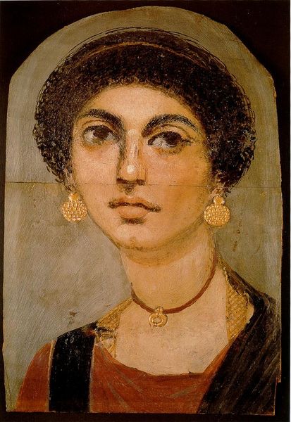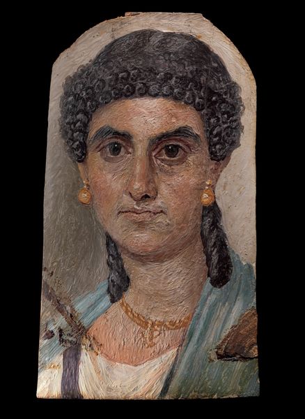 Curator: What strikes me immediately about this Fayum portrait is its almost unsettling directness. The eyes, slightly enlarged, gaze right through you, timelessly. It's like bumping into a ghost who wants to tell you a secret. Editor: And yet, what's equally striking is how *familiar* that gaze feels, doesn't it? The Fayum portraits, like this one, emerged in Roman Egypt around the 1st century CE. These paintings on wood, often done with encaustic or tempera, were affixed to mummies, creating this fascinating fusion of Egyptian funerary tradition and Roman portraiture. Think of them as ancient profile pictures, really. Curator: Exactly! They aimed for a certain… likeness, didn’t they? Though that word feels too flat here. It's not just a representation; it's an attempt to capture… well, what, the essence of this woman's being? And who *was* she? I bet she loved gossip and spicy food! The necklace of green beads she wears gives me a clue to her character: she had fine taste. Or maybe her husband chose it. Oh, and look at those simple but very graceful pearl earrings. Editor: What’s incredible is how they offer a glimpse into a community grappling with identity. Egypt was under Roman rule, a melting pot of cultures and beliefs. The Roman style coexisting with Egyptian religious rituals. The pearl earrings, as you say, hint at some degree of wealth. Many of those portrayed are elites who wanted to commemorate themselves in a fusion of visual vocabularies. These weren’t mass produced; it was more bespoke than the ready to wear Roman statuary. Curator: That little sprig or stick pinning her hair. I wonder what that signifies. Did it have meaning beyond style? Was it simply the current Roman-Egyptian fad, or did it carry an element of personal significance for the sitter? I almost feel like I should apologize for looking at her so directly after so long, you know? She wasn't expecting visitors from so far into the future! Editor: In the history of portraiture, it is an intriguing collision of personal identity, social forces, and mortuary practices. They’re also among some of the only large corpus of painting from the ancient world – making them indispensable objects of study to our understanding of the evolution of artistic traditions. Curator: So, in a way, they succeeded, didn’t they? We’re still thinking about them, feeling their presence across the millennia. Editor: Precisely, a powerful example of how a carefully constructed image can transcend its original purpose and speak to us across vast stretches of time. A lasting testament of cultural exchange!