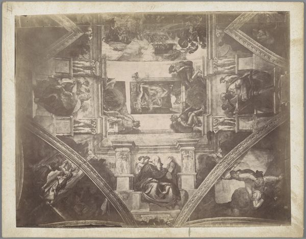 This is a photograph by James Anderson, taken sometime in the mid-19th century, capturing a section of Baldassare Peruzzi's frescoes in the Ponzetti Chapel in Rome. Immediately, the eye is drawn to the curved segments filled with monochromatic scenes; a symphony of sepia tones gives an antique feel. Anderson's composition focuses on the fresco's architectural setting, framing each painted section within rigid, dark lines. The frescoes themselves seem to ripple with movement, full of figures rendered in dynamic poses. This interplay between the static structure and the fluid scenes creates a visual tension, a sort of controlled chaos. Notice how Anderson's focus isn't just on documentation; the photograph’s formal structure highlights the original artist's intent and the broader Renaissance interest in perspective, depth, and architectural integration. It challenges how we view and categorize art, pushing us to reflect on the nature of representation itself. It's a reminder that context and frame are as meaningful as the content they hold.