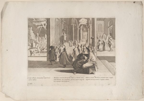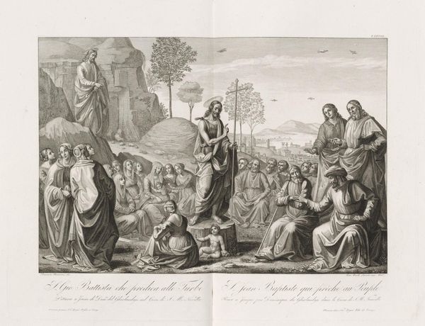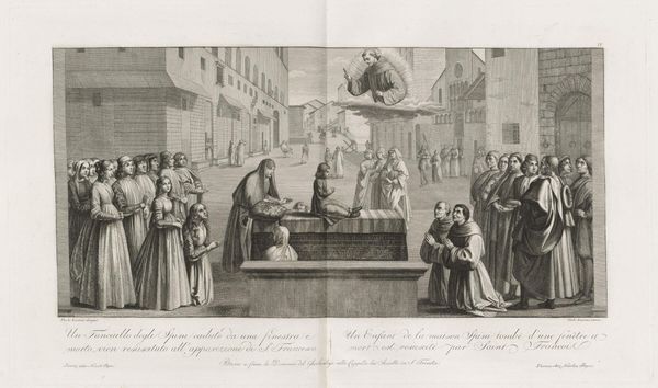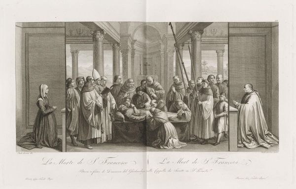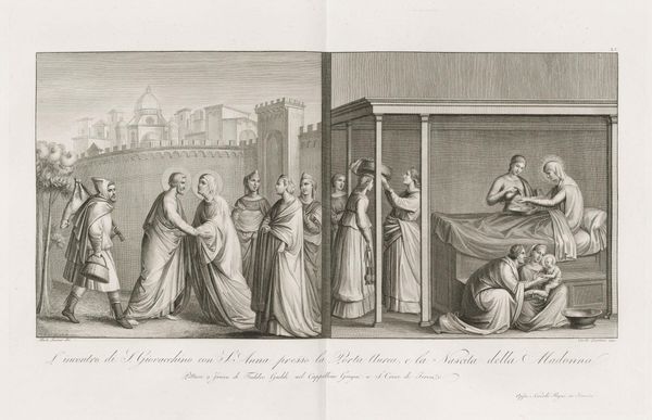Curator: Conte Carlo Lasinio's print, titled "The Virgin Descending the Stairs of the Temple; The Espousals of the Virgin," captures two distinct scenes. Editor: It feels so formal, almost architectural in its precision, but with this really soft light. It's like witnessing a memory, you know? Curator: The imagery references established narratives of the Virgin Mary's life, highlighting themes of purity, destiny, and the patriarchal structures of religious institutions. The two parts are separate, yet feel like a single narrative. Editor: Totally. I'm struck by the expressions, or lack thereof. The figures seem so resigned, which makes me think about how agency is depicted here. Who has it and who doesn’t? Curator: Exactly. The composition reinforces these hierarchies, and it's vital to question how this artwork participates in shaping our understanding of the Virgin’s role within religious doctrine and broader societal norms. Editor: It's strange how such a classic subject can still feel so relevant when you look at it through that lens. There is a deep question about how women and their roles are portrayed in religion and art. Curator: This print serves as a powerful example of how art reflects and shapes our understanding of complex social and religious dynamics, and can inform contemporary conversations about identity and representation. Editor: It’s interesting to consider how we continue to re-interpret these stories, and how we can create new ones that expand the narratives.