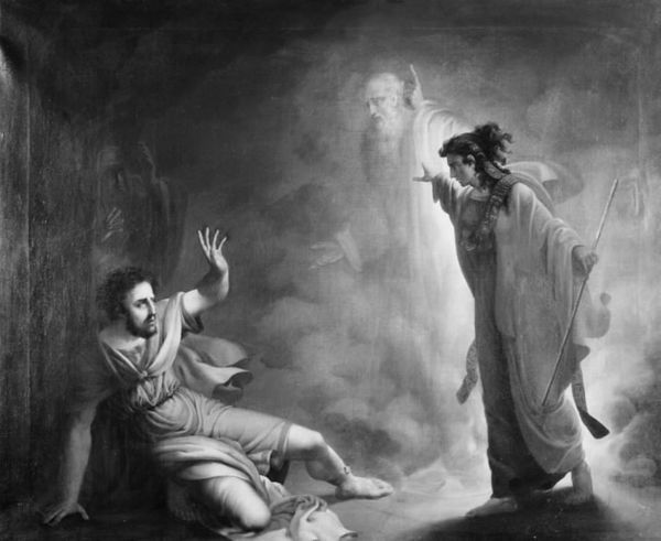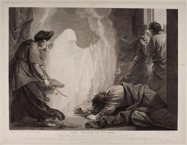 Benjamin West painted "Saul and the Witch of Endor," depicting a biblical scene laden with potent symbols. Observe the spectral figure of Samuel rising from the earth, a motif of resurrection and divine communication. The shrouded form, reminiscent of ancient funerary rites, evokes a sense of mystery. This recalls similar veils and cloaks found in Roman art, where they signify both mourning and sanctity. The Witch’s raised hand mirrors gestures of invocation found in pagan rituals, illustrating humanity's timeless quest to connect with unseen forces. Note Saul's posture, bowed in supplication, as if unconsciously re-enacting ancient rituals of ancestor worship. These recurring gestures, deeply embedded in our collective psyche, manifest across diverse cultures and epochs. The image engages us on a primal level, tapping into humanity's eternal fascination with mortality, prophecy, and the occult. The motifs of the shrouded figure and raised hand continue their dance through art history, each era reinterpreting them to reflect their own anxieties and aspirations. The image is not static, but a fluid entity, its meanings ever-evolving with the passage of time.