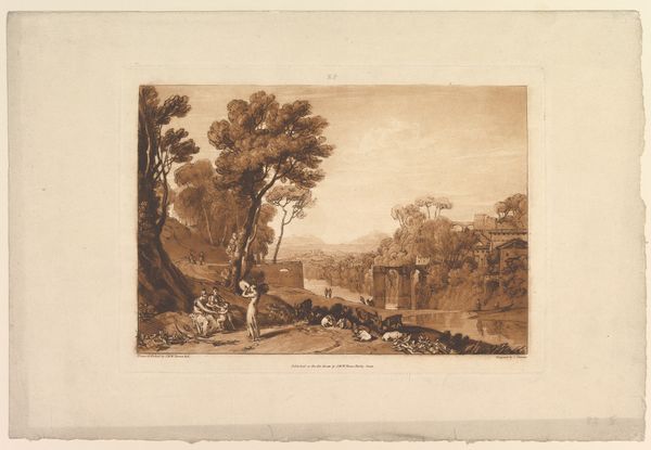 Nicolas Pérignon created this landscape print sometime in the 1700s, using etching. This intaglio printmaking technique involves using acid to cut lines into a metal plate, which is then inked and pressed onto paper. The matrix of metal plate is critical, as the hardness of the metal allows for a high level of detail in the image. The linear quality of the etching beautifully captures the rustic textures and forms of this rural scene. You can see the rough thatching of the roofs, the worn surfaces of the buildings. Consider the labor involved in creating this image. From the initial sketches to the careful work of etching and printing, each step required skill and time. This print not only represents a landscape, but also embodies the values of craft and tradition. By focusing on the material and the making, we gain a deeper appreciation for Pérignon's artistry.