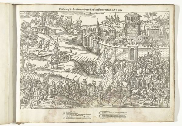 Curator: This print, titled "Beleg van Saint-Jean d'Angély, 1569," was created around 1570 by Jean Perrissin. Immediately, the dense detail overwhelms the eye. Editor: Yes, it's quite striking how much information is packed into the engraving. There’s almost a bird’s-eye view, presenting us with a chaotic yet ordered depiction of siege warfare. I can sense the frenetic energy and violence implicit in this scene, as Saint-Jean d'Angély gets battered into submission. This happened amid a fraught power struggle, the French Wars of Religion that saw Catholics and Protestants clashing violently for dominance. Curator: Exactly. Perrissin’s print documents the siege of Saint-Jean d'Angély by Charles IX during that conflict, the date 1569 detailed in the image's inscription at the top. Notice the systematic layout - we have the besieging forces in the foreground, and the besieged city behind a narrow trench. I can tell by its detail, with tiny figures actively engaged in fighting. Do you agree that composition serves a propagandistic purpose? Editor: In a sense, yes. From a formalist perspective, the use of line, hatching, and stippling to create tone is superb. But I think that any implied statement or narrative purpose remains rooted in aesthetics - consider how Perrissin uses perspectival recession and elevation to offer us both close-up scenes of battle but also a complete overview, this allows him to give form to the complexity and the scope of this military encounter. The contrast between foreground activity and the more placid cityscape lends to an emotional impact on us today, to view this image. Curator: It’s impossible to detach this from the wider context of religious persecution during that time. This image serves as a testament to that specific power dynamic, and what happens at any point in this timeframe. So many other social and historical issues contribute, especially through identity and ideology, which would come into consideration to discuss at another moment. Editor: I concur; for now, appreciating Perrissin's craftsmanship gives us one lens through which to experience a fragment of history that speaks beyond specific dogmas of the past. Curator: And viewing it intersectionally allows us to ask, “How have the historical and material circumstances surrounding such images influenced contemporary political realities, particularly regarding issues of national and social division?”. Editor: A question for the present! Thank you!