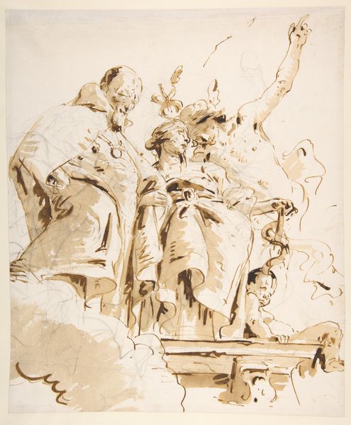 Editor: Here we have Giovanni Battista Tiepolo's "Adoration of the Magi," dating roughly between 1710 and 1770. It's a pen, ink and wash drawing. There’s a flurry of figures; what strikes me is how dynamic it feels, even though it's monochrome. What do you see in this piece? Curator: The immediate observation revolves around Tiepolo’s masterful use of line. Consider the varying weights; observe the bold, confident strokes defining the primary figures versus the delicate, almost ephemeral lines suggesting background elements. How does this contrast in line weight affect the reading of the composition? Editor: It makes the central figures pop, definitely giving them weight and presence. Like they are more important or real. Curator: Precisely. Note also the deployment of *chiaroscuro*, the strategic interplay of light and shadow. How does this enhance the sense of drama and depth within the seemingly limited palette? Look closely at how the washes of ink are applied to model the forms, particularly in the drapery. Editor: You can see the way the light seems to catch on the folds. So, he's using the wash to create volume? Curator: Indeed. Moreover, consider the overall structure. The composition is carefully arranged to lead the eye through a series of interconnected figures and gestures, culminating in a focal point—presumably, the Christ child. Would you agree that this is less of a study, and a preparatory drawing? Editor: Absolutely, I do. Thinking about the figures now, the guy in the bottom left has such loose, expressive strokes that form him. Overall I can see how analyzing these techniques adds to the power of this seemingly simple ink drawing. Curator: It reveals how a close reading based on the elements can create new meaning and interpretation.