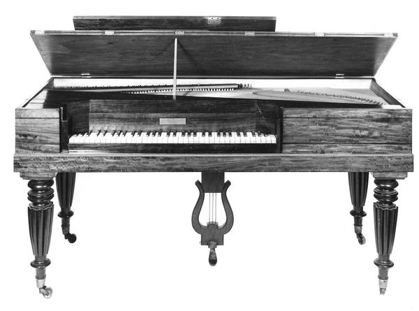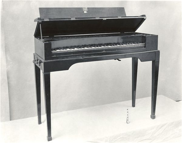 Curator: Good day. Today, we're exploring a square piano crafted around 1850 by Jonas Chickering. You can currently find it here at The Met. It's predominantly constructed from wood and metal. Editor: Oh, my goodness, what a beauty. It has such a somber presence, doesn't it? Dignified. Very rectilinear, until you get to those beautifully carved legs... almost like they're trying to break free of the rigid form. Curator: Well, "dignified" certainly hits the mark! Square pianos, despite their name, were typically rectangular and quite popular in the late 18th and early 19th centuries among the middle class. This style was a bit more affordable and took up less space than grand pianos. We should remember the rise of the bourgeoisie was starting at this point, right? A signifier of aspirational mobility? Editor: Precisely! Having a piano wasn’t just about the music, it was a declaration, wasn't it? I wonder about the hands that once graced those keys, practicing their scales, maybe playing a little Chopin or Schubert, their melodies filling the parlors of New York City… it just whispers stories. Curator: Chickering, though, was a prominent name even then, later becoming one of the largest piano manufacturers in the United States. This one, in particular, suggests a more decorative, upscale instrument than some simpler models you would find at the time. Editor: Absolutely, it is really beautiful and there is definitely an aura to it. You know, the contrast of the dark wood with those ivory keys... that visual binary speaks to larger societal structures. Who had access to music, to education, to refinement? Curator: Very valid! This piece invites us to listen, not just with our ears, but with our imaginations. And to remember what voices, often muted, would never touch these keys or compose their stories for it. Editor: Mmhmm. A powerful silent echo indeed.