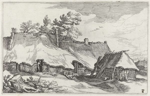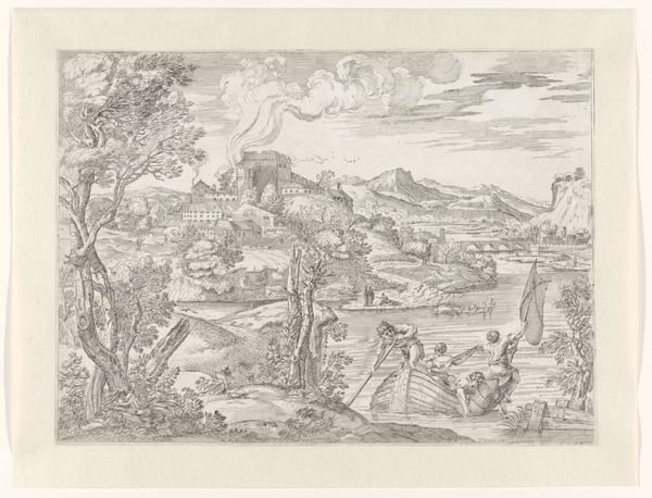Curator: So, here we have “Landscape with Washerwomen,” an engraving by Valentin Lefebvre, dating back to 1682. What are your first impressions? Editor: Oh, it’s giving me “peaceful, yet slightly melancholic.” The detailed linework, it's beautiful, but it's also creating this very structured, almost stoic, feel for a landscape. The little figures though—they introduce such humanity to the piece. Curator: Indeed. Lefebvre was a master engraver, known for translating paintings by Venetian masters into print. It’s fascinating how the printmaking tradition served as a way to disseminate imagery and artistic styles across Europe at the time. Editor: You know, I hadn’t thought of it that way! It’s like the printing press gave these images new lives. I’m suddenly struck by how the composition almost divides into zones—we've got this bustling foreground with, yes, the washerwomen you pointed out; then that somewhat idyllic, organized middle ground; and finally these imposing, almost theatrical mountains way in the back. It’s such a visual feast, like three mini paintings layered into one! Curator: The use of space and perspective definitely speaks to the baroque aesthetic. The washerwomen are grounding the whole image, offering viewers a relatable connection to this sweeping vista, a connection between us and those in the 17th century going about daily life. Editor: Absolutely. And that interplay is what hits me. The overall meticulous detail, balanced by the sense of a casual scene, I almost get a storybook impression. What do you take away from it all? Curator: I see continuity, human resilience against a grand, somewhat indifferent landscape. Even then, the artist wanted to preserve an emotional sense through visual codes. It makes me think about the layers of meaning embedded in landscape art and the visual cues artists and engravers use. Editor: It’s funny; looking at art can really reveal ourselves in a way we didn’t expect.