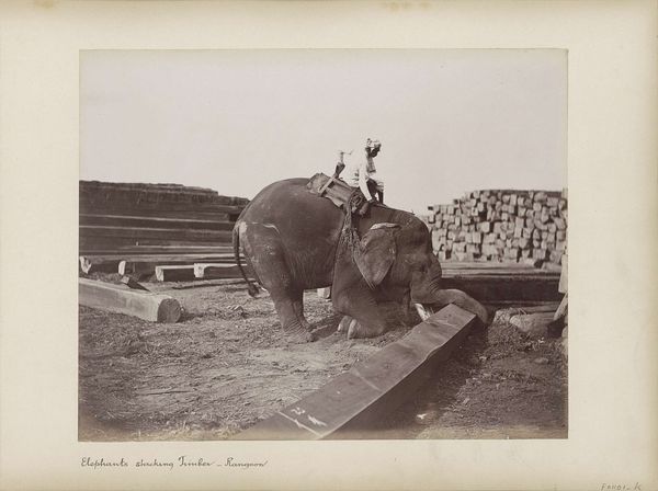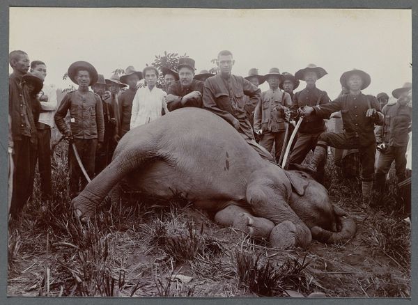 Editor: Here we have "Olifantenjacht bij Krueng Seumpo," or "Elephant Hunt at Krueng Seumpo," an early gelatin silver print made sometime between 1903 and 1913 by an anonymous photographer. The image has a somewhat haunting quality, heightened by the stark realism. A dead elephant lies on the ground, surrounded by a group of people. What strikes you when you look at it? Curator: Ah, yes. It's like staring into a complex mirror, isn't it? Immediately, I think of that potent collision of cultures and perspectives we call Orientalism. The composition almost screams staged reality, doesn't it? The people posed so deliberately, the elephant… a prop, in a way? But the gravity is undeniable. What stories do you think are embedded within this captured moment? What secrets are concealed by the gazes surrounding it? Editor: I hadn't thought of it as staged, but now I see it. There’s a stillness that feels posed, not captured. But I can’t quite put my finger on what stories it hints at. Is it about power, colonialism, or something else entirely? Curator: Possibly all of the above! And maybe something else entirely still! Consider the role of photography at this time. A tool of documentation, sure, but also a tool of constructing narratives, of reinforcing existing power dynamics. This photograph isn't simply recording an event; it's creating an image meant to be consumed, to solidify certain ideas. And yet… the sheer sorrow in the elephant's stillness disrupts any simple reading. What do you think, could our reading be clouded by presentism? Editor: Definitely something to think about. Maybe we’re too quick to apply today’s sensibilities to the past. I'm starting to see how a single photograph can hold so many layers of meaning and conflicting intentions. Curator: Exactly! That tension is precisely where the magic—and the discomfort—lies. Art is about asking the uncomfortable questions, isn't it? A bit like peeling an onion—except, sometimes, you just end up with tears. Editor: I agree! Looking at it now, I'm leaving with more questions than answers, and maybe that’s the point.