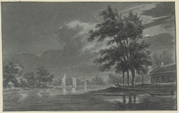 Editor: Here we have Franz Kobell’s “A Boat on the Sea,” a landscape drawing done with ink and pencil, presumably from the 18th century. It's a very subdued, almost melancholy piece. What story do you think this drawing is trying to tell? Curator: Well, its somber tone and focus on nature certainly align it with the Romantic movement. It depicts a ferry scene under an overcast sky or perhaps a sunset. Do you notice the light? The rays emerging from the center… the people gathered? These scenes become more important when contextualized. This work fits neatly into a rising interest in the sublime in nature but also a subtle power dynamic. A collective facing immense nature, waiting for fate. Editor: A power dynamic, that’s interesting! What exactly do you mean by that? Curator: The people are depicted on a boat heading into that light. What could it mean? Is it literal or symbolic? Transportation certainly holds meaning. We often forget that before industrialization, a trip such as this was one of the great journeys many took, for many people. The work makes an ordinary event seem a lot more significant, a larger role than a simple ferry journey, making a universal connection to nature and fate. Does that help illuminate it for you? Editor: Definitely. Thinking about the social context adds a layer I hadn’t considered. I see it now - the vastness of nature compared to the tiny boat full of people, emphasizes both human vulnerability and resilience. Thanks for pointing that out! Curator: Of course! Thinking about the audience reception and cultural forces, like burgeoning ideas of self-determination against the immense nature, is always essential in interpreting art from this period.