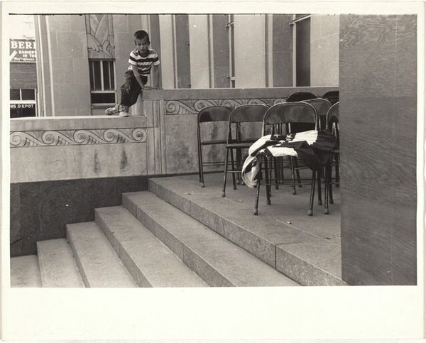 Editor: This photograph, "Public Ceremony--Casper, Wyoming" by Robert Frank, a gelatin-silver print from 1956, has this strangely deserted feel to it. There are chairs set up, like people were just here, but now… nothing. What's your take on what's happening here? Curator: Deserted is definitely a key feeling. I look at this and imagine tumbleweeds – wrong state, I know – but the air of forgotten Americana is powerful. Frank captured the country, sometimes gloriously, sometimes not so much. A public ceremony implies community, civic pride. But these empty chairs... there’s a palpable sense of absence, of something missing from the American promise. Or perhaps the back of the room, or those bits of what seem to be cloths left as reminders of those not present. Editor: Do you think that feeling was intentional? It's such a stark image, almost like a stage set after the actors have left. Curator: Absolutely, intentional. Frank was a master of capturing those off-kilter moments, the ones that speak volumes without saying a word. This isn’t a celebratory snapshot; it's a meditation on what those celebrations really mean, or what is leftover of them when all go home and things resume normalcy, maybe with a void to fulfill. Are these ceremonies empty gestures or meaningful expressions of shared values? The photograph doesn't answer, it asks. What’s more, who do you think gets to participate, and who gets to witness? The viewpoint, somewhat distant and impersonal, doesn’t lend itself to inclusion, does it? Editor: That makes me think about how history gets recorded, and who gets left out of the narrative. It's much more layered than I first thought! Curator: Precisely! A photo like this keeps whispering questions. And in a gallery, maybe a hushed visitor feels they might know a few possible answers... or maybe it just keeps reminding them that what remains also shapes the present.