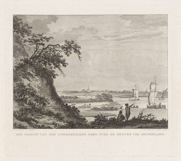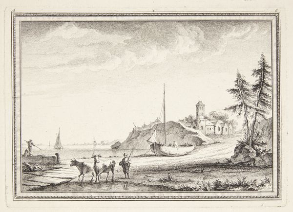 Curator: Look at this captivating cityscape drawing, "Udsigt over en havn, i forgrunden to fiskere," dating back to between 1750 and 1795, currently housed here at the SMK. The artist is Jeanne Francoise Ozanne, and it is rendered with etching and ink techniques. Editor: My initial reaction? Serenity, punctuated by labour. The almost ethereal sky contrasts with the immediate grounded presence of those two fishermen. There is also some sense of historical significance, like peering into a time capsule. Curator: That's insightful. The contrast you observe also extends to the themes. This etching successfully weaves together cityscape elements, evoking a sense of place, with the very real human element of labour within history. Editor: And what do these serene harbour scenes whisper about history? It is almost as if the tranquil facade masks underlying sociopolitical currents. Who gets to relax on a boat in that harbour, and who has to row? And for what ends? Curator: The maritime elements certainly lend themselves to speculation about trade, power, and exchange. Ports, especially in that era, are where the private meets public. In terms of symbology, it evokes the larger forces at play. Editor: Absolutely. And look at how the artist uses ink! The sky alone is a marvel of subtlety. It goes to show the possibilities of pen and ink outside the world of letters and text. There is light there. But, tell me, is there a conscious decision on Ozanne's part? A vision? Curator: We can look into how Ozanne plays with Baroque styles—she has injected realism to contrast against the era’s artistic grandstanding. She’s memorialising an actual locale—with history but, most interestingly, not historical figures. Common figures take precedence here. Editor: Fascinating, because ultimately it prompts reflection on not just a scene, but all scenes. Everyday places can teach a lesson if only one took the time to look—really *see* like Ozanne did. Curator: Precisely. The image quietly prompts to ask ourselves, what symbols will *we* choose to remember the places we inhabit now? Editor: That’s a profound point to conclude on! It makes me think about what *my* view would look like in the ink strokes of the past…or future!