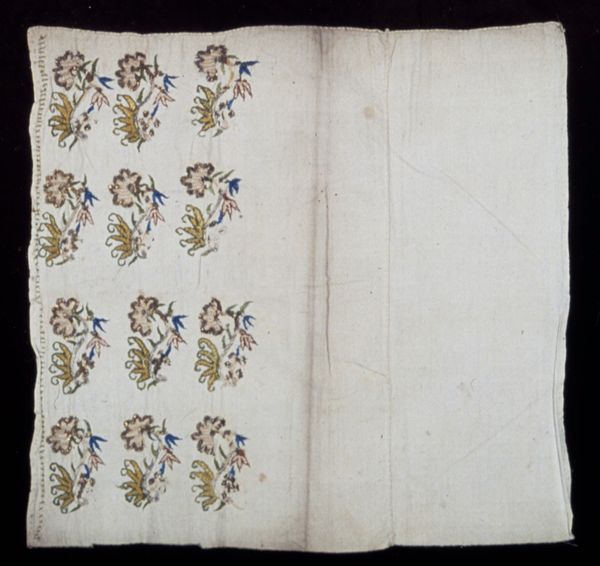 Editor: We’re looking at an embroidered “Costume Sample,” made with mixed media and textile, probably in the late 18th century. It’s at the Minneapolis Institute of Art. It's just...charming. It makes me think of Marie Antoinette playing shepherdess. What draws your eye? Curator: Oh, utterly charming! It whisks me away to a world of powdered wigs and whispered secrets in manicured gardens. What fascinates me is the *fragmentary* nature of it. This isn’t a finished piece, but a record of possibilities. Can’t you almost smell the lavender sachets? Think about the anonymous artisan painstakingly stitching each tiny flourish, imagining the grand gown it might adorn. Who was she? Was it purely imagination or a commission? Editor: A commission perhaps, if someone was trying to find a specific color or style? I can almost feel the fabric now that you mention it. How was something like this used back then? Curator: Exactly! Perhaps to court favour of an exacting patron? These samples were vital tools, miniature arguments for the sartorial splendor to come. The level of detail is astonishing. Notice how the watercolor accents dance with the textile work— it is an attempt to capture how it all lays, hangs and sparkles. Look at the stylized flowers, the geometric borders and playful vignettes and wonder - how does that little pastoral scene play into the final costume design, or does it? They weren’t merely copying; they were composing symphonies of thread. Editor: So, it's almost like a mood board from the 1700s! Curator: Precisely! It bridges the gap between concept and creation. A tangible dream! That little pastoral vignette at the bottom. Is it Watteau, perhaps? Or a future waiting to be lived, felt and seen anew.