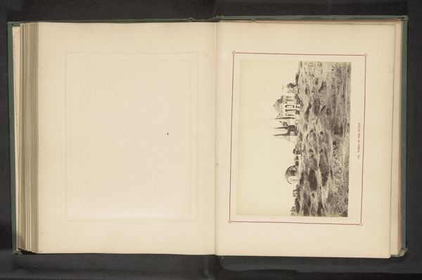 This anonymous photograph depicts the Rolandseck train station with the Siebengebirge mountain range in the background. Likely taken in the late 19th century, this gelatin silver print speaks to the rise of both photography and mass tourism. Photography itself was a rapidly evolving technology at this time, demanding specific chemical knowledge and skilled labor to produce an image with clarity and detail. In this case, we see a sharp focus achieved through careful manipulation of light-sensitive materials. This contrasts with the romantic landscape, now newly accessible through the modern convenience of rail travel. The photograph is pasted into an album, suggesting its role in the burgeoning culture of collecting and documenting experiences. It captures a specific moment in time, a confluence of industrial progress and leisure, now flattened and preserved through photographic chemistry. It challenges us to consider how technological advancements impact our relationship with the natural world, and how these relationships are further mediated through the images we create and consume.