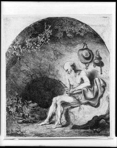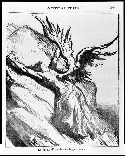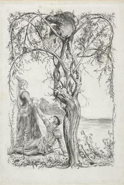 Editor: This drawing is called "Hoest" by Theodor Severin Kittelsen. It seems to be an ink sketch on paper, showing a woman carving a heart into a tree. The overall feeling is melancholic. How do you interpret this work? Curator: The stark contrast in the drawing certainly creates a dramatic, almost unsettling atmosphere, doesn’t it? Think about the act of carving a heart into a tree. It speaks to a desire for permanence, for claiming a space, a relationship. But consider who has the power to make those claims and whose voices might be silenced in these traditionally romantic narratives. Is the woman’s gesture an act of empowerment or is she conforming to societal expectations around romance and commitment? Editor: That's interesting. I hadn't thought about it in terms of power dynamics. Curator: Also, let's consider the forest itself, particularly in the context of late 19th-century Norway. How did the prevailing romantic ideals of nature and national identity play a role in the formation of gender roles, particularly for women and marginalized communities, in that specific social context? What can we glean from her isolation in this forest? Editor: So, by carving into the tree, she's almost participating in a dominant narrative, rather than creating her own? And is Kittelsen maybe questioning that? Curator: Precisely. By visually emphasizing this solitary act, Kittelsen may be asking us to critically examine the performative aspects of love and the constraints they impose. Who does this imagery include and who does it implicitly exclude? What questions about societal structures and their influence on intimate relationships does this raise for us today? Editor: I see it differently now. It's not just a romantic image, it’s prompting a much broader discussion. Curator: Exactly! Art can become a space where we actively question societal norms.