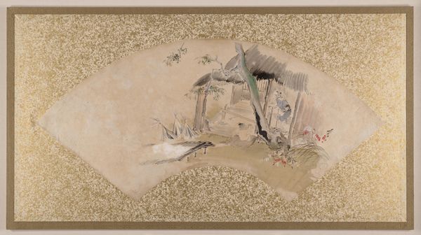 Curator: At first glance, there's an almost dreamlike quality to this image. The textures are intriguing. Editor: Indeed. What we have here is “Flowers on Grass,” crafted sometime between 1867 and 1891 by Shibata Zeshin, utilizing tempera, watercolours, and even a touch of impasto. The work currently resides at the Metropolitan Museum of Art. What resonates for me is the implicit commentary on cultural aesthetics in play, even the politics of viewing in what might first appear as simple subject matter. Curator: The way he presents the flowers against the bold strokes of grass almost feels symbolic, contrasting delicate beauty against a backdrop of grounded reality. It recalls ancient artistic traditions, connecting us to Japan's cultural heritage while inviting modern contemplation. Editor: Yes, the representation of the grass feels gestural almost as though mimicking a fan shape, echoing the landscape as a contained element. The use of a conventional, delicate approach to depict foliage while contrasting with the larger context of sweeping impressionistic grass lines could symbolize the control and chaos experienced within modernization. I consider also how it can relate to traditional roles within Japan between this period and its present time in terms of labour. Curator: It is very true, while one reads such tension and resistance to its chaos of transformation, one can sense it may echo personal moments for some too; from the gold backdrop of this piece to its more personal renderings. We may come close to such moments, of beauty and simplicity when our natural environment allows it through. Editor: Yes and by juxtaposing a natural landscape within the backdrop of gold almost feels like an endorsement on precious metals, maybe the artist is trying to evoke class struggles? I find these dichotomies very powerful. Zeshin positions us to look closer into society in multiple scales. Curator: It's remarkable how an artwork can function as a kind of historical and personal mirror, refracting various cultural contexts, symbols, and individual encounters across generations. Editor: Exactly, and understanding those cultural symbols helps us see more clearly—how art can become both an object and a method for understanding shared experiences. Thank you.