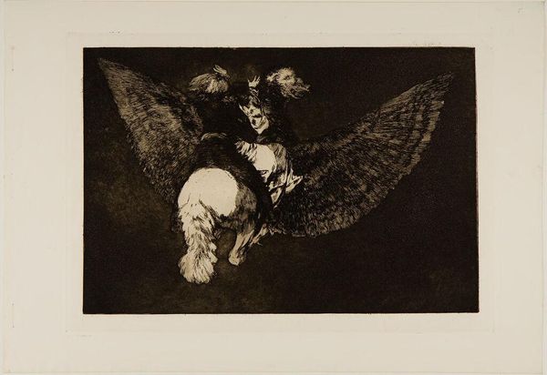 Editor: This print, "Where There's A Will There's A Way: A Way of Flying" by Francisco José de Goya y Lucientes, features figures soaring—or plummeting—through a dark sky. There’s a sort of manic energy, don’t you think? What do you see in this piece? Curator: Absolutely manic! Goya, bless his heart, was wrestling with the Enlightenment’s lofty promises—reason, progress. See those winged figures? They’re Icarus, but with a dash of Spanish satire. Are they flying high, or just crashing spectacularly? Editor: So, it's a commentary on ambition, maybe? Curator: Precisely! And the human condition itself. We strive, we dream, sometimes we soar, sometimes we belly-flop. Goya’s reminding us that even with the best wings, a little humility goes a long way. Editor: That’s… wonderfully bleak. I’ll never look at ambition the same way. Curator: Isn't it fantastic? Art that makes you question everything.