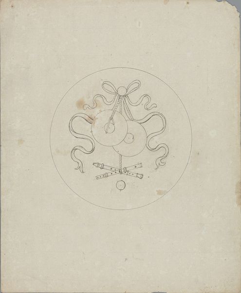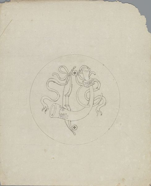 Pierre Félix van Doren created this drawing of a large wind instrument in the 19th century. The composition immediately draws the eye to its subject, centered and neatly encased within a circle. The use of line is delicate, almost like a blueprint, inviting us to consider the instrument's design as much as its artistic representation. The winding curves of the horn and the surrounding ribbon create a visual rhythm, a dance of form that is both structured and fluid. This interplay challenges fixed meanings of musical representation. Here, the instrument is not merely depicted; it's examined as a complex structure. Consider how the meticulous details—the spirals on the horn's bell and the precise rendering of the tubing—function within the drawing's broader aesthetic. Van Doren uses the instrument's form not just for its musical purpose but as a means of exploring shape and space. It emphasizes that artistic interpretation evolves over time, constantly reshaped by new perspectives.