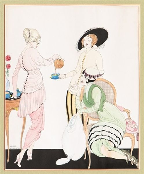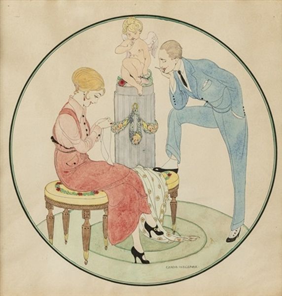 Curator: This lively piece, titled "Le Bal Masqué," comes to us from the hand of Gerda Wegener. It appears to be a watercolor and ink drawing. Editor: What a playful scene! It’s titillating, but also carries this undertone of anxiety with the surprised face and demonic character. The muted pastel palette enhances its slightly unsettling, dreamlike atmosphere. Curator: It certainly seems to capture the decadence and social dynamics of its era, perhaps even commenting on it. Gerda Wegener was known for her Art Nouveau style, but also for her exploration of gender and identity. She achieved visibility within the public Parisian Salons. Given her unique position as a queer woman working and showing in this world, how might that inform our understanding? Editor: The masked ball itself is loaded with symbolic potential. Masks offer a freedom from societal constraint, allowing a glimpse beneath the surface. The butterfly wings on one woman represent transformation, a release from the earth-bound caterpillar, maybe an embrace of something more transgressive. The devil costume is fairly self explanatory. What do you think she is communicating in revealing this kind of dynamic among women? Curator: Given the art historical and socio-political contexts of the time, perhaps a challenge to restrictive norms around female sexuality and agency. The provocative display could be interpreted as both a celebration and critique of these gatherings, these moments where societal boundaries blurred, particularly within the circles Wegener navigated. She’s capturing this exciting atmosphere and maybe the tensions embedded within it. The nude woman performing a burlesque gesture feels intentional in the messaging. Editor: Exactly! These balls allowed women to occupy and subvert traditional spaces, momentarily dismantling conventional hierarchies. The performance implies defiance against what it meant to be a woman during that era. Curator: These spaces gave Wegener a freedom and safety, too, and as her visibility rose, so did that freedom to push beyond conventional art. Seeing that shift, even just within the last few years of the 1910's into the 1920's feels very clear within Wegener's drawings and paintings. Editor: It leaves us to ponder what really happens behind the masks. Is it liberation or just another performance? Curator: I agree, there’s a deliberate ambiguity. "Le Bal Masqué" serves as a poignant reminder of the shifting social tides during that time, capturing the essence of art and its potential for both escapism and cultural change. Editor: A great artwork is always that which makes us think deeply and invites so many different possible interpretations!