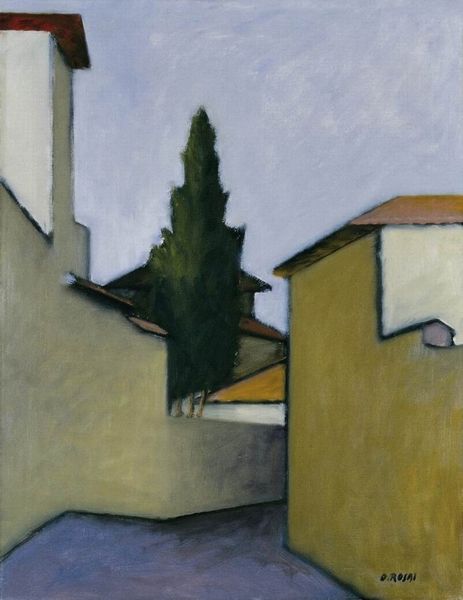 Ottone Rosai made this painting, *Paesaggio*, with oil on panel, and what strikes me first is its subdued palette, like a memory fading into the light. You can see how the forms are built up with gentle strokes, layer upon layer, suggesting a process of feeling out the scene rather than just depicting it. The paint here isn't trying to hide anything. It’s fairly thin and you can see how Rosai uses the brush to shape the light as it falls on the buildings, the trees, and the ground. Notice the way the dark greens and browns of the trees in the background are almost silhouetted against the pale sky. The brushwork here is a little rough, a little broken, giving the whole scene a sense of quiet melancholy. That small tree in the foreground is rendered in soft, rounded shapes, a sort of meditation on the natural world. I’m reminded of Morandi's landscapes with their similar muted tones and focus on simple geometric forms. Like Morandi, Rosai finds beauty in the everyday, turning the ordinary into something quietly profound. It’s a reminder that art doesn’t always need to shout. Sometimes, it whispers.