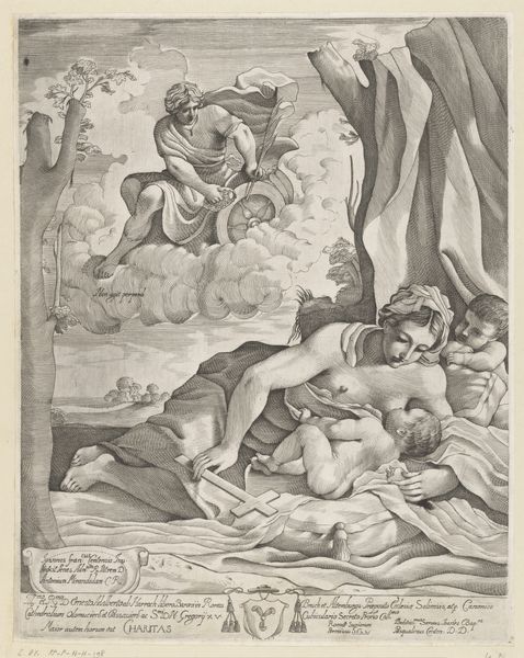 Curator: This is Giovanni Battista Pasqualini's "Charity," an engraving of remarkable detail and symbolic weight. Editor: Immediately, I’m struck by the contrasting textures—the billowing clouds above against the sharp lines defining Charity and her children. Curator: Indeed. The figure above, perhaps representing divine providence, seems to direct events, his wheel a symbol of fate and change. Charity, as the allegorical mother, embodies nurturing and earthly concern. Editor: And the strategic placement of the cross beneath her—a visual anchor uniting maternal love with Christian virtue, further emphasizes the work's intended message. Curator: Placing this print within the context of the Counter-Reformation, it speaks to the Church’s emphasis on good works and maternal ideals as a response to Protestant critiques. Editor: A powerful synthesis, then, of form and content, where the artist’s choices reinforce the prevailing social and religious narratives. Curator: Precisely. It encourages us to think critically about the roles assigned to women, and the power structures at play. Editor: And for me, the stark contrasts and precise lines evoke a sense of moral clarity, making this print an effective didactic tool of its time.