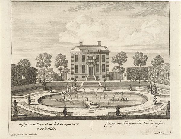 Curator: This engraving offers us a glimpse into the Duinrell estate, dating back to somewhere between 1675 and 1711. The artist is anonymous, which tells its own story, doesn’t it? Editor: It certainly does. The cool restraint gives the work a balanced almost symmetrical, but perhaps sterile quality. I notice right away that everything is in its proper place, a designed and produced landscape devoid of materiality other than what’s been laid down to form a kind of viewing stage in front of the pavilion. Curator: It speaks volumes about the relationship between the aristocracy and the land during that period. We see a formal garden setting; everything manicured and controlled. It presents an ideal, a statement of power and order reflected in the landscaping itself. This reflects the era’s emphasis on rational design, impacting society’s power structures too. Editor: Definitely. But, look closer, this is a printed piece, likely mass-produced, to sell an idealized view. What materials were readily available to reproduce at that time? What class was being pandered to here? These benches look hastily created. A viewing box as much as anything. Curator: Precisely! This print would have circulated amongst a certain class, reinforcing societal norms of beauty and status. Think about the function of printmaking then, serving to democratize access to images, but also standardizing aesthetic tastes. It shows that gardens weren't just spaces, but statements carefully crafted for social impact. Editor: It raises important questions about consumption, wouldn’t you say? I mean, paper production relies on linen or other discarded fibres at the time. Is that labour accounted for, acknowledged here? It’s an engraving of something carefully, deliberately constructed for visual appeal but divorced from raw making itself. Curator: Absolutely, the distribution of these prints created shared social values of refined taste while further defining the concept of land ownership and aesthetic value. Consider the influence on landscape design: a ripple effect, shaping what was considered desirable or socially advantageous. Editor: It’s a fascinating reflection of its time, this image – its attempt to capture not just scenery, but aspiration. Curator: Agreed. The work illuminates so many cultural threads of the era.