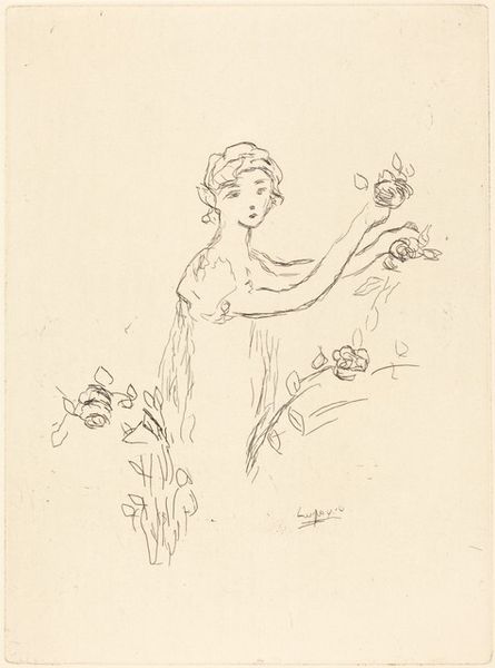 Curator: Welcome! Today, we're looking at a drawing by Pierre Laprade titled "Two Women with Flowers in Their Hands." It’s an ink drawing, seemingly a print as well, which makes me wonder about the reproducibility and circulation of such images in his time. Editor: Ah, the first impression is airy, like a half-remembered dream. The linework is so delicate, almost like watching the memory of these figures. Curator: Delicate, yes! Laprade’s choice of ink really gives it a lightness. Think about how ink allows for these fine, quick lines—it's not about heavy detail, but about capturing a fleeting moment. We see that play out beautifully with these figures amidst the garden flora. It really draws you in to consider the material realities of its production and dissemination as an image. Editor: It does. Are they picking flowers? Offering them? I get a distinct feeling of springtime, of new beginnings and gentle exchange. Maybe Laprade sought to express a simple offering here, the giving of nature to each other. Curator: And there’s something subtly radical, wouldn't you say, in choosing everyday moments, the intimate acts and exchanges? Laprade wasn't depicting grand historical scenes, or high society portraits necessarily. Instead, there is something grounded in labor practices in that this image circulated more broadly to a middle-class audience. It redefines what's worthy of artistic representation, which is interesting in thinking about what ink drawings afforded Laprade. Editor: That focus is beautiful. It suggests beauty resides everywhere if we have the eyes to see it—even in these commonplace exchanges, between people or within nature itself. I think the medium becomes part of that. Curator: Right? Laprade's ink doesn't confine; it liberates. The quick gestural strokes evoke that feeling of immediate interaction, drawing us closer to understanding and truly engaging with our social world, no matter the labor. The labor that went into disseminating this image…fascinating! Editor: Yes, so much freedom, like petals on the wind. I come away thinking about ephemerality, really. Thank you. Curator: My pleasure! This exploration makes one appreciate both the moment and what it takes to produce and distribute such a moment as widely as this artist could.