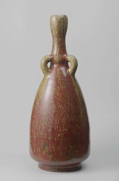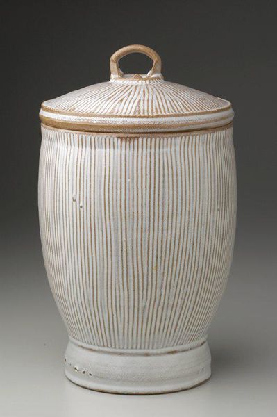 Here we have a vase, made with clay by Ellen Shankin. Notice the vessel’s structure. Shankin has formed a symmetrical object that ascends from a square base to a circular mouth. A tension exists between the vase’s angles and curves. A mottled band of color diagonally bisects the belly of the vase, forming a textured, lozenge-shaped figure. The artist’s choice of colors enhances this tension; a burnt umber rises from the base, blending into shades of ochre, pale greens and cream. This palette suggests organic materials, evoking earth and vegetation. Two handles rise from the midsection, each a concave curve. These contrast with the horizontal grooves at the neck of the vase. The clay of this vase is not merely a medium but an active participant in the artistic process. The form and treatment of the clay destabilizes the tradition of the vase as a purely functional object, transforming it into a site of aesthetic and intellectual engagement.