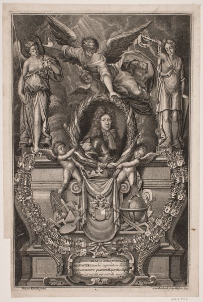 Curator: What we have here is an early print from between 1600 and 1700 entitled "En adelig dame på sit dødsleje," which roughly translates to "A Noble Lady on her Deathbed." It's currently held at the SMK, Statens Museum for Kunst. The artist is Hubert Schaten, a master of capturing both grand spectacle and intimate human moments. Editor: Wow, what a dramatic scene! The sheer detail in this engraving is amazing. It’s such a powerful image of death, but also... celebratory, almost? What are your initial thoughts? Curator: Celebratory is a fascinating observation. You’ve cut right to the quick, really. Consider the period – Baroque art often reveled in dramatic contrasts. Here, death isn’t a grim end, but a transition, perhaps a triumphant one for a woman of noble standing. Do you notice all of the heraldry displayed? Editor: Yes! Those crests and symbols—almost overwhelming the composition. Curator: They speak volumes about lineage, power, legacy. It's not just the death of an individual, but the passing of an era, a continuation of a dynasty. And observe the figures – idealized, almost theatrical, each playing their part in this elaborate farewell. Do you find a hint of, perhaps, *stagecraft* in how it is presented? Editor: Definitely! Now that you mention it, the whole scene feels very carefully orchestrated, like a scene from a play. Curator: Precisely! It's a performance of mourning, designed to convey a particular message about the deceased and her family. Line and engraving serving narrative. Editor: So, it's not just a snapshot of a death, but a carefully constructed image designed to tell a story. I’ll definitely look at baroque art differently from now on! Curator: Yes, it is both, really. Looking deeper beneath the veneer. Now, perhaps, you might say we have only just begun to unveil the complexities of Baroque printmaking in Europe.