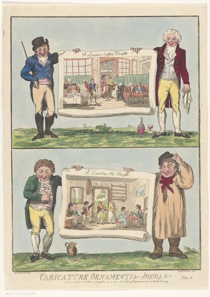 Curator: Welcome! Let's discuss this etching by George Cruikshank, titled "Jagend en vissend gezelschap," which translates to "Hunting and Fishing Company." It was made, probably with etching and watercolor, sometime between 1800 and 1805. Editor: Thanks! It’s interesting, the way the figures seem to be presenting these scenes within a scene – hunting and fishing. It feels like Cruikshank is offering commentary on leisure activities. What can you tell me about its context? Curator: Precisely! Cruikshank, known for his caricatures, thrived in a period ripe with social and political satire. This work, beyond just depicting leisure, acts as a lens to examine societal norms around hunting and fishing. Who participates in these activities, and what does their portrayal tell us? Consider how access to these pursuits reflect class distinctions during that period. Do you think it idealizes or mocks the subjects? Editor: It definitely leans towards mockery! The figures are quite exaggerated, almost grotesque. Especially the hunting scene— it is more absurd and slapstick! The fishing looks more restrained, more peaceful. Is there a particular meaning in contrasting these two types of pastime in one image? Curator: That's insightful. Cruikshank might be playing with contrasting notions of leisure and sport, or the disruption of rural life by new social groups claiming a stake in hunting and fishing as leisurely entertainments.. The very title 'Caricature Ornament for Screens' tells us this print might have been intended as a fashionable and easily disseminated form of social critique. Now, let's consider how it challenges established visual conventions for depicting the English countryside? Editor: Hmmm, interesting point about challenging conventions. Now I can appreciate that it really operates on several levels: depicting activity, poking fun, and also subtly critiquing access to that activity by the different layers of society! Thanks for opening my eyes! Curator: Absolutely, it is multifaceted. These works served an important role in the popular political imagination!