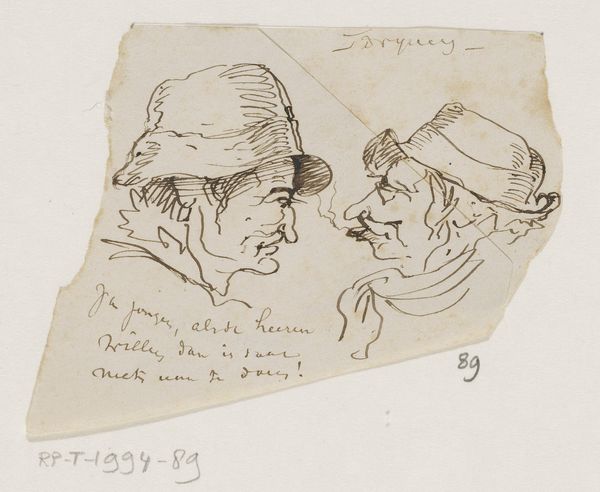 Johannes Tavenraat created this drawing, "Two Heads with Bible Verses," using pen and brown ink. The composition is dominated by two grotesque heads in profile, facing each other, which are drawn with dynamic, almost frantic lines. This imbues them with a raw, immediate energy. The hasty application of ink suggests a kind of automatic drawing, as if Tavenraat sought to bypass conscious thought to capture something more primal. Note the loose cross-hatching that defines the figures; this isn't about refined realism but rather about conveying a sense of character through form. The faces are caricatures, exaggerating features in ways that border on the absurd. The accompanying biblical verses, written in elegant script, seem almost ironic when paired with such unflattering depictions. The juxtaposition creates a tension that invites us to question traditional relationships between text and image, sacred and profane. Tavenraat’s sketch thus functions as an ongoing site of interpretation, a space where viewers engage with the formal qualities and cultural codes that shape meaning.