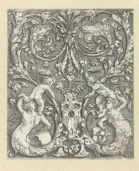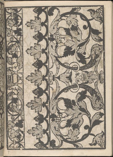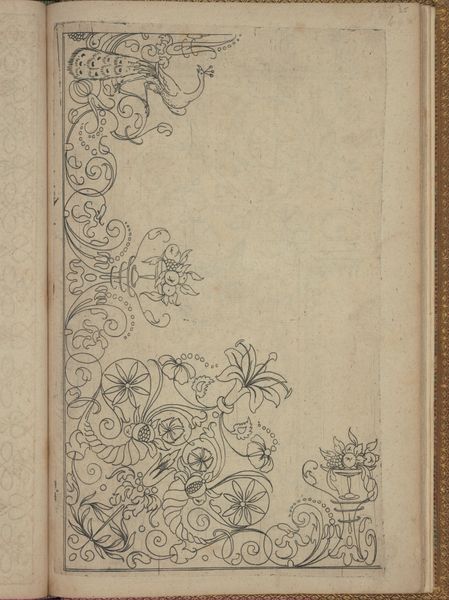 Editor: This is "Album of Flower Paintings," dating roughly from 1855 to 1905, by Fathallah Shirazi, rendered in ink and paint on paper. I am really struck by the contrast between the botanical illustration within the oval and the geometric decoration surrounding it. How do you read that tension? Curator: Note first the precise delineation of forms. Each petal, leaf, and stem meticulously rendered with subtle gradations of tone. Consider how the artist uses line to define shape and create volume. Do you observe any inconsistencies, areas where the illusion falters? Editor: Not really, it all feels pretty cohesive to me. But I’m interested in the sort of visual vocabulary the artist employs... I mean, it all seems a bit stylized to be literal representations of plant life. Curator: Indeed. Consider the framing geometric elements. How do those shapes play against the botanical rendering contained within the form? Semiotically speaking, what tensions are evident? Editor: So you’re thinking about what meaning is produced by having this tension, by playing with those formal contrasts? Curator: Precisely. Line, tone, shape, form; they all carry an information load. Does that tension resolve itself? Where does your eye settle? Editor: I think my eye wants to go back and forth between the outside geometric shapes and the organic illustration. It does create tension, which means I get sort of stuck visually in the piece as a whole. Curator: The formalism supports the intended iconography; surface, texture, line, light and shadow; this enhances my appreciation. What a wealth of potential resides in a singular work!