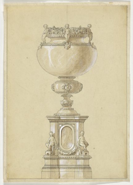 Curator: Here we have "Kelk," a pencil drawing on paper created circa 1830-1850 by Firma Feuchère. It appears to be a preliminary sketch of a chalice or goblet. Editor: There's a delicate, almost ethereal quality to it, don't you think? The light pencil work on the toned paper gives it a sense of aged beauty and refinement. Curator: Indeed. Feuchère was a French firm known for its metalwork designs. This sketch, most likely from a personal sketchbook, provides a glimpse into the design process of such ornate objects that often played important roles in religious and aristocratic contexts. The design elements – scrolling foliage, stylized figures – are so evocative of power, the church, and nobility. Editor: Look at how the artist meticulously renders the form, creating subtle gradients to convey depth. The symmetry is perfect, and it invites the eye to move up from base to lip of the goblet, while losing some detail towards the center. It is almost like two halves of different perspectives melded together. Curator: That contrast between the detailed design and the sketch-like execution is interesting. The question this object raises for me is whether objects like this promoted shared or hierarchical beliefs. While an object can serve as a uniting symbol for its viewers, its very possession implies economic or class inequality. Editor: Certainly, the object itself is a powerful visual statement of faith and authority. Note the emphasis given to proportion, balance and the subtle chiaroscuro effect in the piece. It creates a real sense of volume and light. The question, of course, is whether its purpose is decorative or illustrative. Curator: Perhaps both. These aesthetic qualities contributed to an overall symbolic narrative, lending further gravity to the act of partaking from such an item. In any case, it would be intriguing to uncover the narratives that accompanied pieces commissioned from such a workshop during the time. Editor: An excellent point! It certainly underscores the interplay of faith, art, and society. Curator: And perhaps raises some further questions for future visitors as they examine works in other rooms in the collection. Editor: Precisely! This pencil study is really fascinating and a reminder of what can be achieved by quiet contemplation.