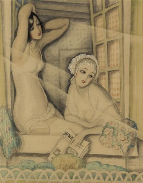 Editor: This is Peter Newell's illustration, "Alice Between Two Sleeping Queens," created for Lewis Carroll’s "Through the Looking-Glass." The whole scene has this dreamlike quality, but the expressions on the queens’ faces are just… strange. What do you see in this piece? Curator: The symbolism here is thick with cultural memory. Sleep, often a metaphor for the subconscious, positions Alice between two figures of authority rendered powerless. Consider how Newell uses the crowns – symbols of power – to frame Alice, almost trapping her between established norms. Editor: So, the queens represent this… oppressive structure? Curator: Perhaps. Or maybe the vulnerability of established power. Newell invites us to question the stability of those structures and Alice's role within them. What does their sleep signify to you? Editor: That’s fascinating. It’s like Newell’s using familiar symbols to show how reality is a little more complex than it seems.