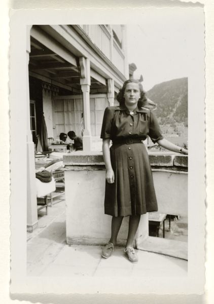 This photograph, "Isabel Wachenheimer staand voor een bergpartij, Davos, 30 juli 1946," was taken by an anonymous artist, capturing a moment in time. The composition embraces a simple, almost documentary style, highlighting the subject against the backdrop of a mountainous landscape. The grayscale palette, a hallmark of the era, softens the scene, allowing the viewer to focus on the textures and forms. The subtle gradations in tone create a sense of depth, particularly in the depiction of the mountains and the town below. It's not about perfection; it's about recording a lived moment, similar to how artists like Gerhard Richter use photography as a basis for exploring memory and representation. Look at the way the light falls on Isabel's dress, creating subtle folds and shadows. This attention to detail, however understated, gives the image a sense of realism. This image invites us to contemplate the beauty of everyday life and the ways in which photography can capture and preserve fleeting moments. Like painting, photography is a process of interpretation and meaning-making.