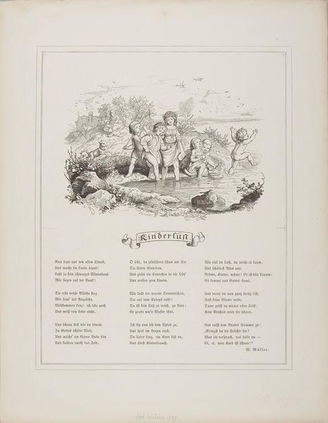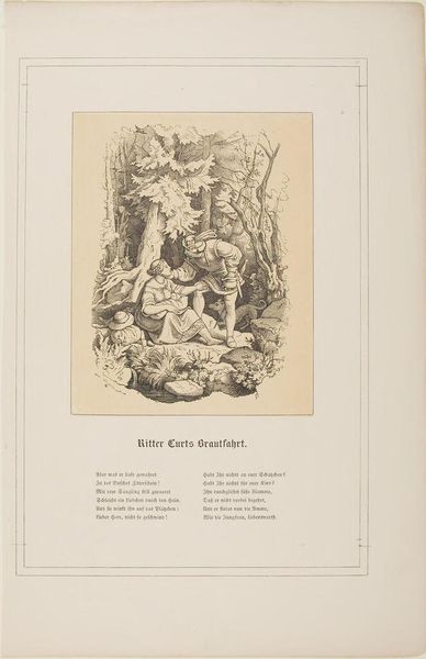 Curator: This intriguing engraving, titled "Der Getreue Eckhart," comes from an anonymous hand, featured in an 1853 "Goethe Album." I find myself drawn to its delicate lines and the story it seems to whisper. Editor: It feels like a dark fairytale, doesn't it? The huddled children, the old man with the staff… a sense of foreboding hangs in the air. Curator: Well, that 'foreboding' might be rooted in the cultural context. "Faithful Eckhart" is a German folk legend—a night watchman who warns against dangers, especially for children. Editor: Ah, I see! The watchman is guiding or protecting, perhaps? The imagery is certainly potent, even without knowing the original story. Curator: Exactly. It's interesting how these printed images circulated folk narratives, reinforcing moral lessons. Editor: So, it served a public function, shaping social values. Makes you wonder what tales our own art will tell in the future. Curator: Indeed, the artwork sparks so many thoughts on how stories shape cultures. Editor: Absolutely. It’s a gentle, ominous reminder that some stories never fade.