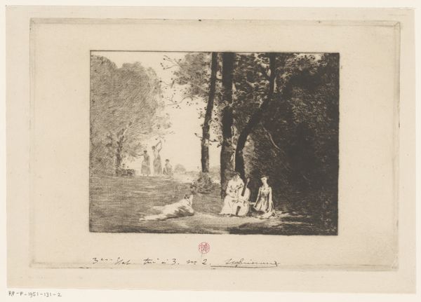 Editor: So, here we have "Mercury and Argus," an engraving by Albert Duvivier from 1881, currently held at the Rijksmuseum. It depicts a scene with figures resting beneath a tree alongside animals. It feels almost dreamlike, quiet. What do you see in this piece, from your perspective? Curator: This engraving offers us a lens through which to examine the power dynamics embedded within classical narratives. Mercury's deception and Argus's imposed servitude resonate deeply with histories of oppression. Duvivier presents a deceptively tranquil scene, but doesn't this calm belie a struggle for power and agency? Consider Argus, forced into constant vigilance by Juno, his gaze a symbol of relentless surveillance. How might this relate to contemporary experiences of being surveilled or controlled? Editor: That’s interesting! I hadn't considered it that way. The peaceful composition initially distracted me. Curator: Precisely. It's easy to be lulled by the idyllic setting. However, when viewed through the lens of social power structures, Argus represents those whose bodies and labor are relentlessly exploited and controlled. And Mercury? What about *his* motivations in the broader historical context of class and privilege? Duvivier, though working in the 19th century, inadvertently offers a critique ripe for exploration with modern intersectional theory, don't you think? Editor: Definitely. Viewing it through the power dynamics completely reshapes my understanding of the piece. It highlights the inherent inequalities embedded in these seemingly harmless narratives. I now wonder how other classical scenes might be unpacked similarly. Curator: Exactly. It compels us to question not only the surface narrative but also the social forces at play, making us more aware of the underlying biases and structures within art, both past and present.