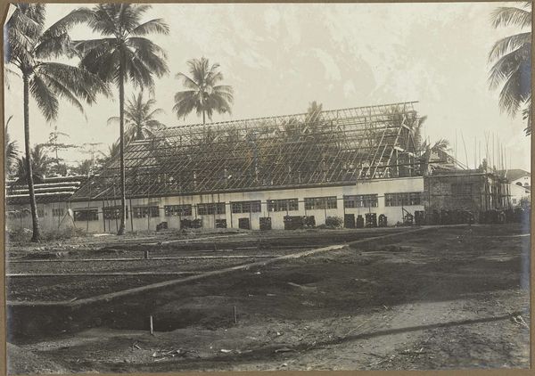 This photograph, "Grote villa in Simpangampat in aanbouw," captures a building under construction, its skeletal structure exposed, somewhere perhaps in the Dutch East Indies. It’s a work of documentation, and art. The anonymous photographer reveals their process through stark contrasts. The rough, almost chaotic, scaffolding and unfinished roof juxtapose against the solid, geometric brickwork below. Look at that unfinished roof, a web of dark lines against the pale sky, it looks like a drawing. The texture of the image is almost tactile, you can almost feel the roughness of the wood. It reminds me of a Cy Twombly painting, where the visible layers of mark-making reveal the artistic process. Similarly, here, the unfinished state is the subject. The photo becomes a meditation on the idea of progress. It is as much about the present as it is about the future, an ongoing conversation about time and place.