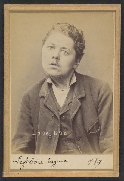 Curator: Standing before us is a photograph by Alphonse Bertillon, titled "Lamure. Eugène, Clément. 20 ans, né le 5/11/73 à Paris Ier. Gérant de magasin. Anarchiste. 2/7/94." It dates from 1894. Editor: The subject’s gaze is direct and unnerving. There’s a profound sadness, maybe even defiance, radiating from his eyes. The muted tones amplify the somber mood. Curator: Bertillon’s approach to photography was less about art and more about scientific documentation, part of a broader effort in the late 19th century to categorize and control the burgeoning urban populations. It's interesting that Bertillon, using the supposed objectivity of science, also identified Lamure as an Anarchist in the photo's title. This inherently imbues the photograph with political connotations. Editor: Absolutely, this image serves as a stark reminder of how easily individuals and their identities can be politicized and categorized, often unjustly. It makes you consider the precariousness of freedom and dissent then, and now. Curator: Bertillon developed the "portrait parlé," a verbal description system coupled with standardized photography to identify repeat offenders. These images were instruments of power, serving to surveil and manage individuals deemed outside the norm. They were tools of the state. Editor: Precisely, seeing the label “anarchist” transforms this portrait into more than just a record. It hints at the socio-political anxieties of the time. What did being an anarchist mean for Eugène Lamure, beyond being a store manager? How did that label shape his life? Curator: Exactly. And the composition, though seemingly simple, emphasizes this sense of control. The tight framing, the plain background – all contribute to the subject's vulnerability before the law. Even his clothes are a social statement - this is no ragged revolutionary, he’s a petit bourgeois. Editor: Thinking about today, it speaks to the surveillance society, how biometrics and algorithms classify and sometimes misclassify, entire populations. Curator: Indeed. Bertillon’s project raises serious questions about the power of visual representation and the ethics of control. Editor: The photograph prompts us to consider the cost of dissent and the importance of protecting individual liberties. Curator: It’s a hauntingly beautiful piece that reflects anxieties about shifting social orders.