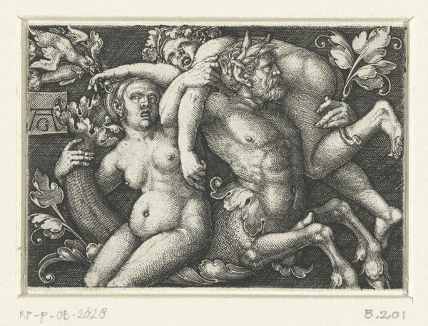 Heinrich Aldegrever created this Ornament with Leaf Tendrils and a Female Triton with Child in the 16th century using metal engraving techniques. The composition presents a dense interweaving of organic and figurative elements, rendered in stark black and white contrasts, creating a visually rich surface. The use of line is particularly striking. Aldegrever employs varied linework to define shapes and convey texture. The robust forms of the triton and child contrast with the intricate, flowing patterns of the leaf tendrils. This juxtaposition invites a semiotic reading, where the idealized human form meets the wild, untamed aspect of nature, reflecting the Renaissance interest in harmonizing classical and natural motifs. The ornament's visual complexity destabilizes any clear focal point, challenging fixed meanings and hierarchies, leaving us to question the relationship between humanity, nature, and ornamental design.