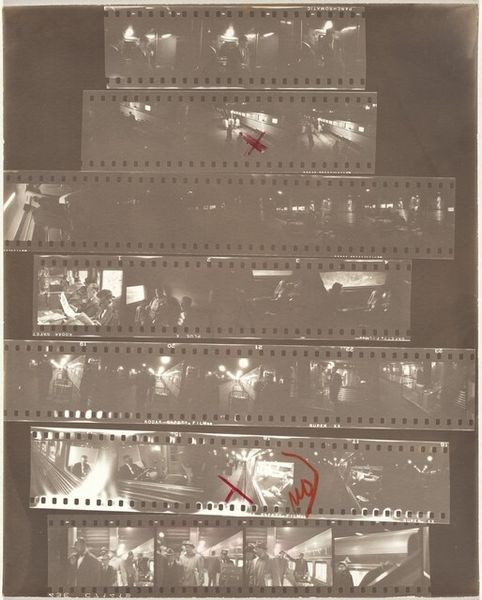 Editor: Robert Frank’s gelatin silver print, “Guggenheim 157—New York City,” made between 1956 and 1957, strikes me as a kind of visual poem. It’s all these layers of images, a collection of fleeting moments that hint at something bigger. What stories do you see woven within this photographic contact sheet? Curator: Indeed, the contact sheet format is itself a powerful symbol. Frank gives us access to the artist’s eye. The film strips suggest memory, how moments blur and fade, yet leave impressions. Consider the repetition of figures in transit, people going up and down elevators. How does the architectural symbol of the Guggenheim contribute to the meaning? Editor: I think the spiral structure of the Guggenheim is present even though it is not literally captured. It is a suggestion of upward movement. It is a metaphor for social climbing, or maybe spiritual ascension? Curator: Perhaps. Or consider that a symbol can operate in different ways. What do elevators mean within cultural narratives? Elevators are liminal spaces, where status, power, and anonymity are brought together. Consider these images alongside those from Frank’s seminal book, *The Americans.* Editor: The images feel like stolen glances, somehow both detached and intimate, echoing that sense of American alienation that is prevalent in his book. The sequencing and choice of images becomes as significant as the subjects themselves. How does Frank imply meaning here through repetition? Curator: Note how people are often looking away. Some appear trapped. The recurrence of blurred figures symbolizes how easily people become lost, dehumanized within modernity. He invites us to recognize that beneath the gleaming surface of the city lies a pervasive sense of isolation. Editor: I see what you mean; the images offer a poignant look at that mid-century anxiety. Thank you! Curator: A potent and visually arresting meditation. It will stay with me.